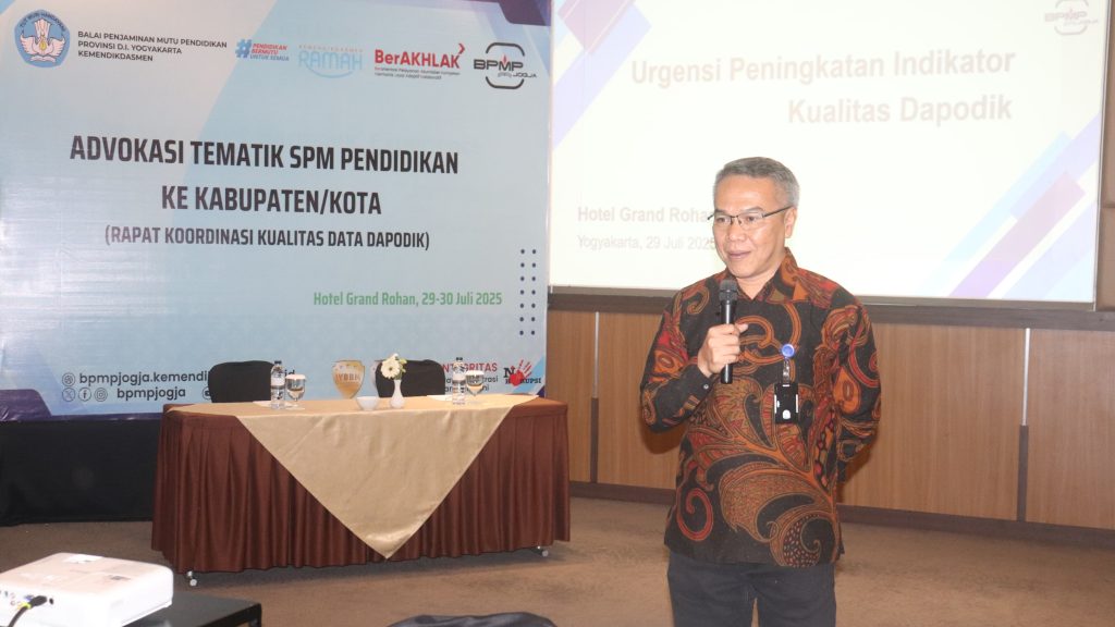 Bantul – Balai Penjaminan Mutu Pendidikan (BPMP) Provinsi Daerah Istimewa Yogyakarta menyelenggarakan kegiatan Advokasi Tematik Standar Pelayanan Minimal (SPM) Pendidikan selama dua hari, Selasa dan Rabu (29–30/7/2025), bertempat di Grand Rohan Hotel, Bantul. Kegiatan ini menjadi ajang strategis untuk memperkuat koordinasi kualitas data Dapodik antara BPMP dan Pemerintah Daerah.